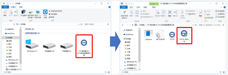打开“此电脑”- 选中“CD驱动器 CFCA标准版管理工具”盘符, 右键点击此盘符后选择“打开”,双击“CFCA_UKTool.exe”安装